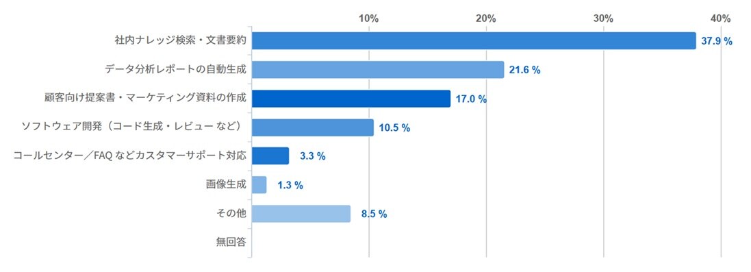 「社内ナレッジ検索・文章要約」が37.9%と最も多く、膨大な社内資料や過去事例から必要な情報を迅速に