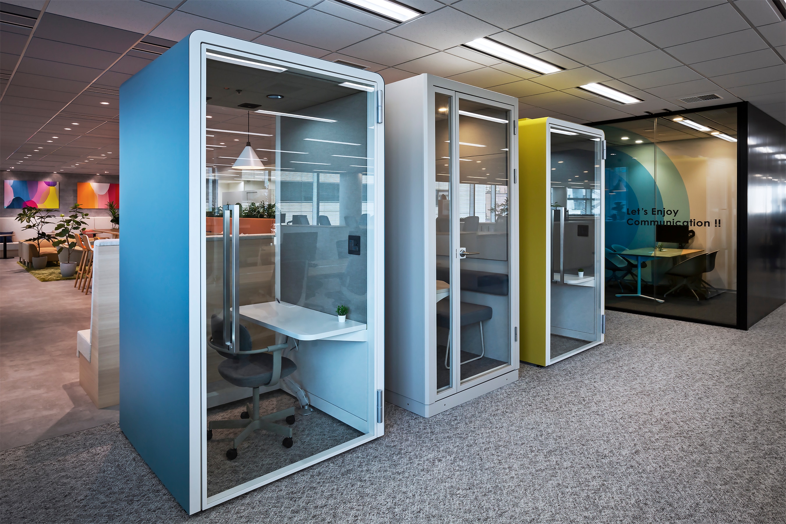 大人数でコミュニケーションを取りやすい空間や、集中して作業に没頭できるエリア、web会議等に対応可能な複数タイプの個室ブースなどを設置しております。